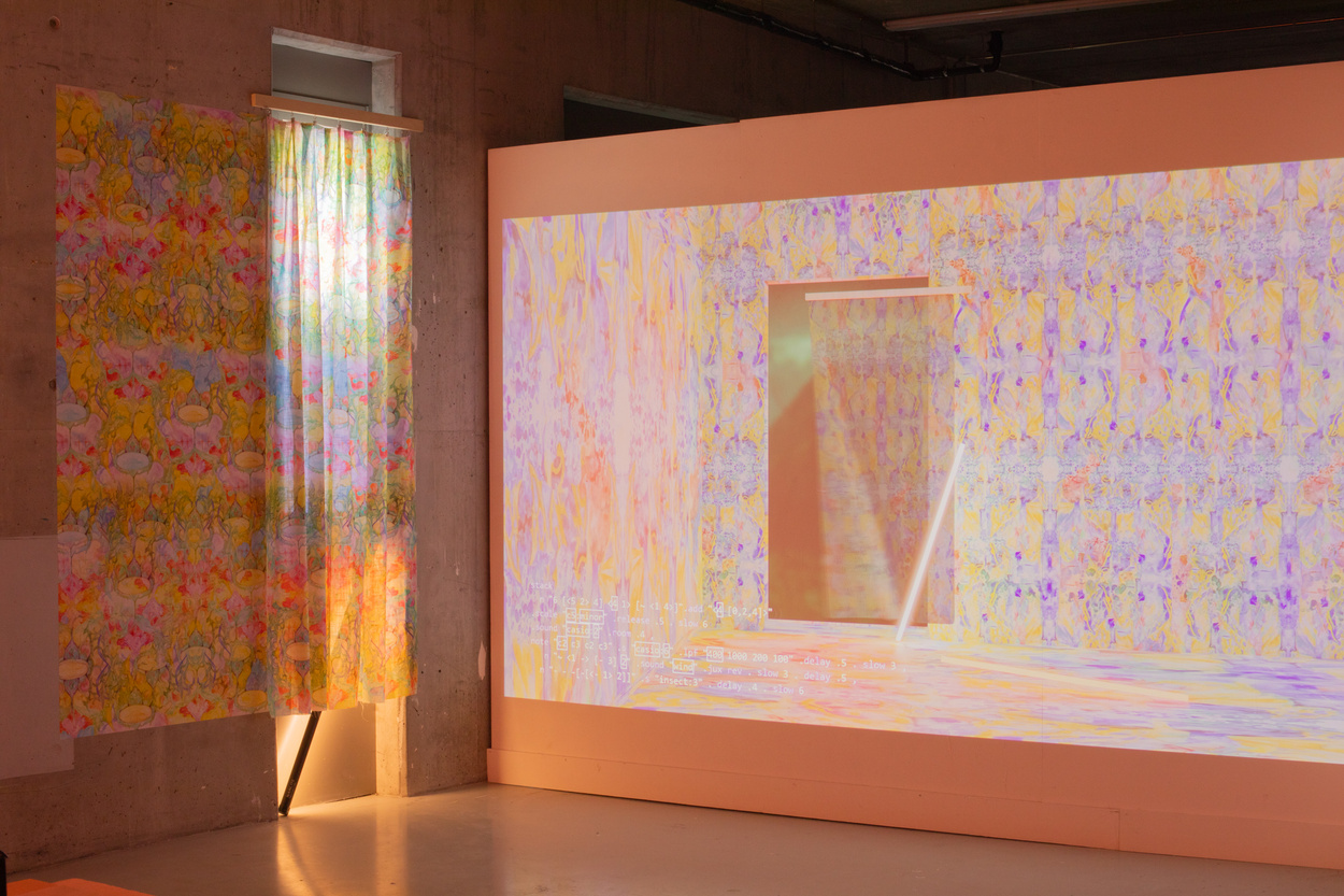 digital print on paper and fabric, 3D animation, watercolor, CNC plotter, light and sound installation